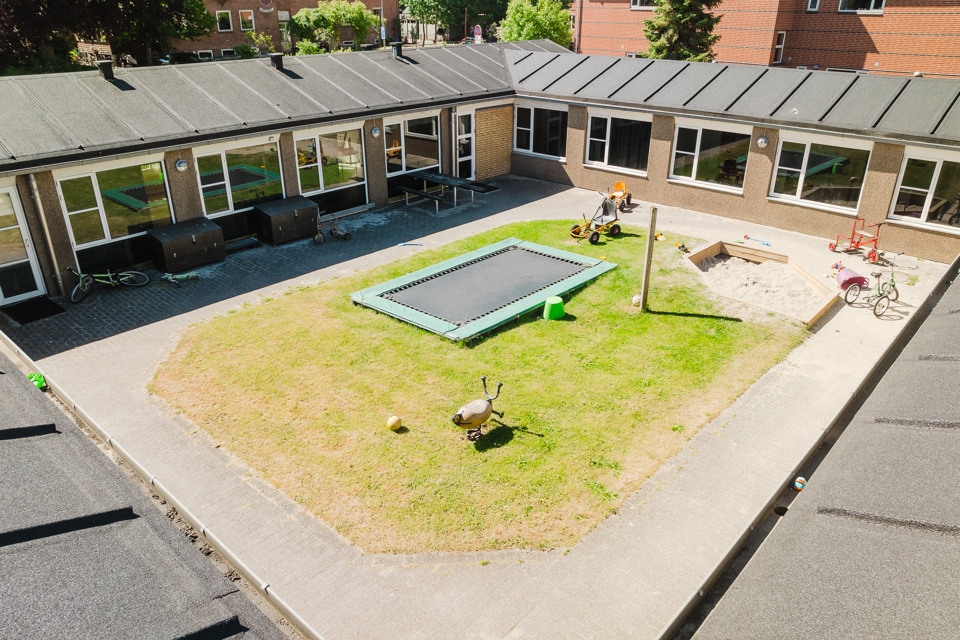 På legepladserne har vi blandt andet trampoliner, cykler og en gynge, og der er mulighed for at spille basket og fodbold eller at spille på vores udendørs musikinstrumenter.